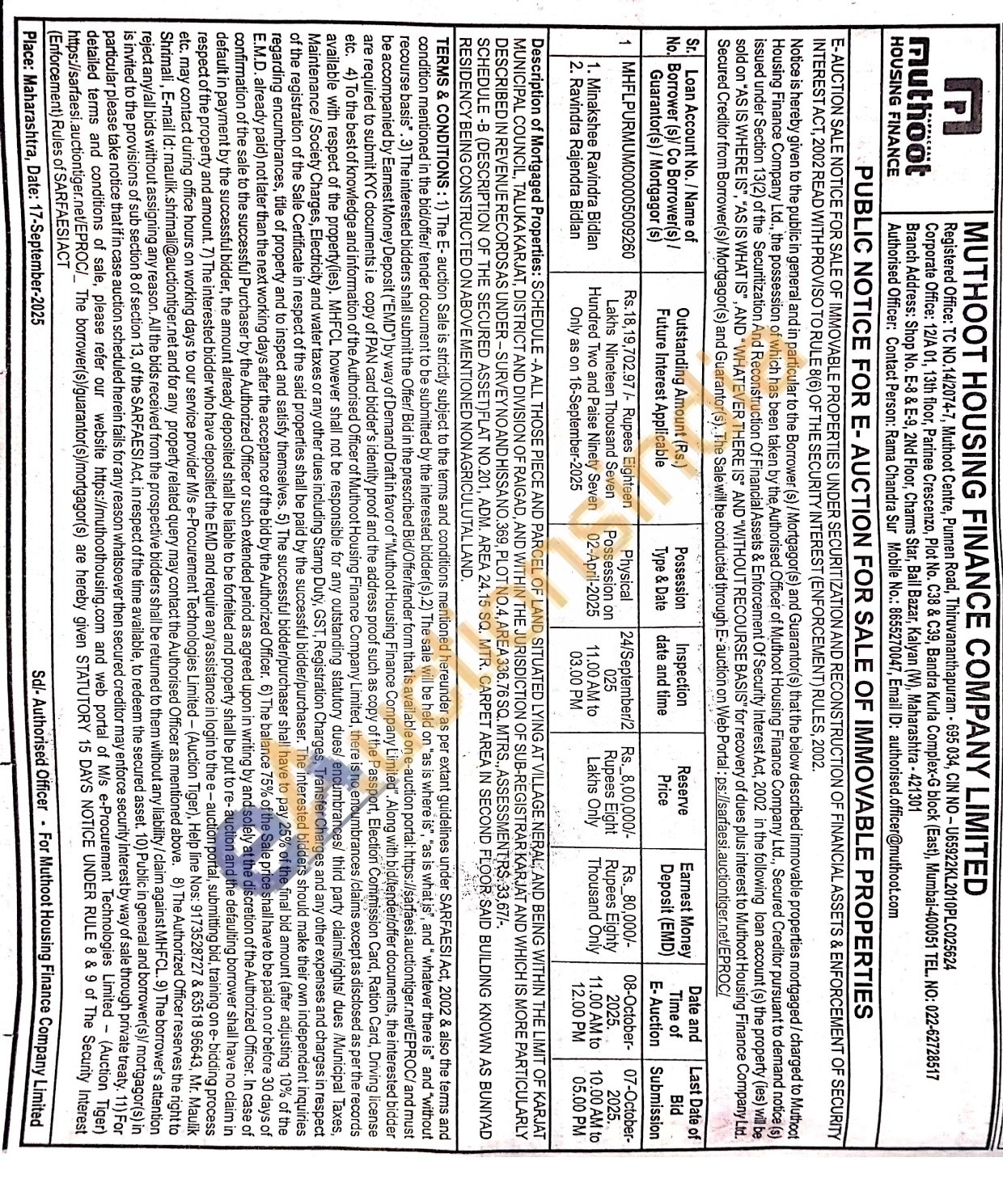 Description of Mortgaged Properties: SCHEDULE -A ALL THOSE PIECE AND PARCEL OF LAND SITUATED LYING AT VILLAGE NERAL, AND BEING WITHIN THE LIMIT OF KARJAT MUNICIPAL COUNCIL, TALUKA KARJAT, DISTRICT AND DIVISION OF RAIGAD, AND WITHIN THE JURISDICTION OF SUB-REGISTRAR KARJAT AND WHICH IS MORE PARTICULARLY DESCRIBED IN REVENUE RECORDSAS UNDER-SURVEY NO AND HISSANO.369, PLOT NO.4, AREA336.76 SQ. MTRS., ASSESSMENT RS: 33,67/-. SCHEDULE-B (DESCRIPTION OF THE SECURED ASSET) FLAT NO.201, ADM. AREA 24.15 SQ. MTR. CARPET AREA IN SECOND FLOOR SAID BUILDING KNOWN AS BUNIYAD RESIDENCY BEING CONSTRUCTED ON ABOVE MENTIONED NON AGRICULUTAL LAND.