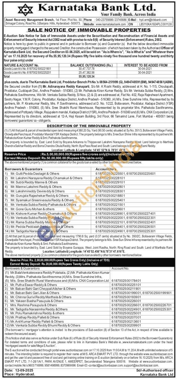 2) All that part & parcel of residential open land measuring 1790.8 Sq. yard (0.37 cents) situated at Sy No. 350/2C, Bollavaram Village Fields, Chowtpalle Panchayat, Proddatur Mandal YSR Kadapa District. The property belongs to M/s. Sree Sun Shine Infrarepresented by its partners Mr. Pathakota Kiran Kumar Reddy & Smt. Pathakota Savithramma.