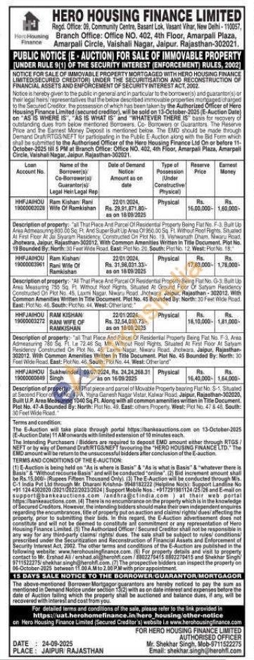 Description of property:"all That Piece And Parcel Of Residential Property Being Flat No. F-3, Area Admeaturing 780 Sq. FLL 7246 S M So Mr. Without Rool Rights Situated At First Floor At Satyam Residency Constructed On Plot No. 45. Laxmi Nagar Niwaru Road Jhotawara, Jaipur, Rajasthan 302012. With Common Amenities Written In Title Document. Plat No. 45 Bounded By: North: 30 Feet Wide Road East: Plot No. 45 South: Plot No. 44, West: Other land"