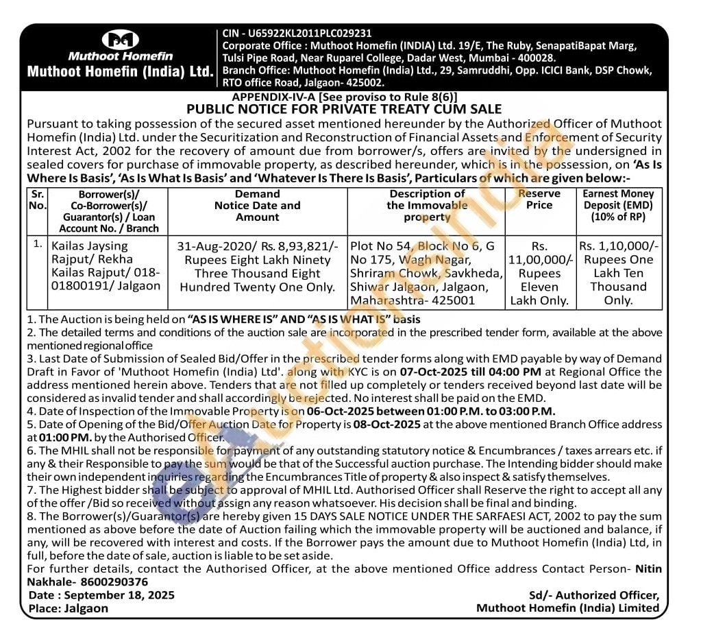Authorised Officer, at the above mentioned Office address Contact Person- Nitin Nakhale- 8600290376