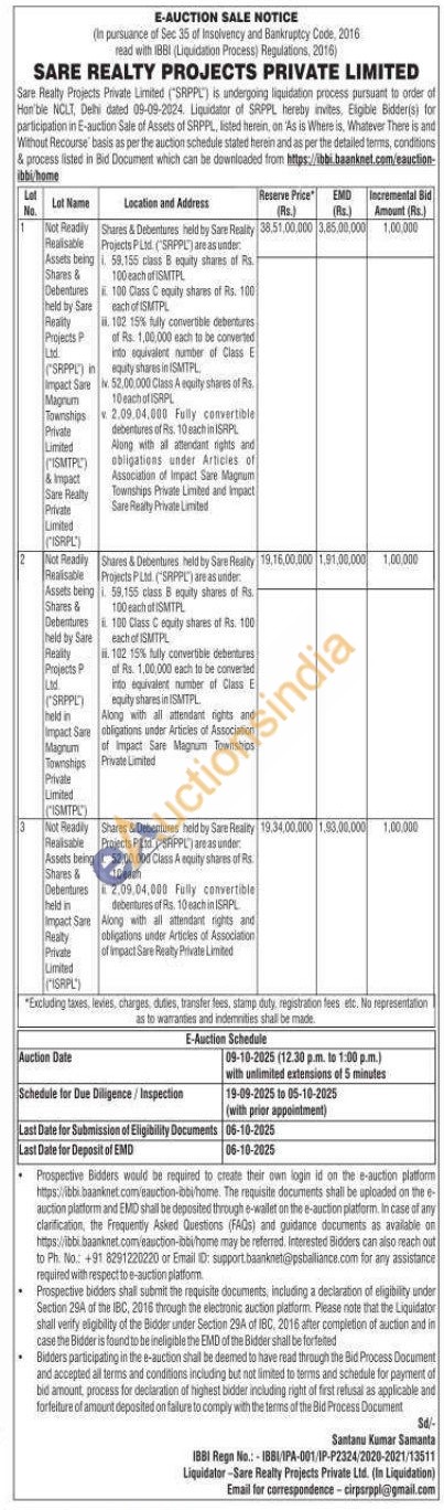 Shares & Debentures held by Sare Realty Projects P Ltd. ("SAPPL) are as under