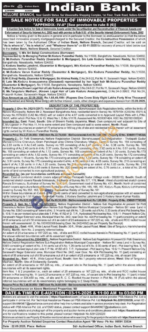 Property-2: Sri Pott Sreeramulu Nellore Registration District- Stonehousepet Sub-Registration Thotapalli Gudur Mandal-Chinna Cherukuru Gram Panchayat area Chinna Cherukuru Village Land in Survey No. 164 consisting of Ac.2.83 cents in it Ac.0.45 cents. Survey no. 165 consisting of Ac.2.47 cents in it Ac. 0.38 cents, Survey No. 166 consisting of Ac. 2.40 cents in it Ac. 0.37 cents, Survey No. 167 consisting of Ac.3.92 cents in it Ac. 0.61 cents, Survey No. 168 consisting an extent of Ac. 1.12 cents, Survey No. 169 consisting an extent of Ac. 1.30 cents. Survey No.170 consisting an extent of Ac. 1.62 cents, Survey No. 171 consisting an extent of Ac.4.28 cents, Survey No. 172 consisting an extent of Ac. 1.18 cents, Survey No. 173 consisting an extent of Ac. 1.74 cents, Survey No. 174 consisting an extent of Ac. 3.91 cents, Survey No. 175 consisting an extent of Ac. 4.59 cents in it Ac. 4.08 cents, Survey No. 216 consisting an extent of Ac. 1.38 cents in it Ac. 1.20 cents, Survey No.218 consisting an extent of Ac. 1.83 cents, Survey No. 219 consisting an extent of Ac.0.65 cents & Survey No. 220 consisting an extent of Ac. 0.76 cents ie., a total of Ac. 25.48 cents of land converted to non-agricultural purpose. Bounded by: (as per boundaries certificate annexed herewith) East: East of combined sketch covers adjacent village Thotapalli Gudur (Village code 0928016), South: South of combined sketch covers Ravula Srinivasulu, Sudhakar of Survey No. 177, 176, West: West of combined sketch covers Ravula Srinivasulu, Sudhakar of Survey No. 214, 215, Government road of Survey No. 431, North: North of combined sketch covers agriculture fields of Bommi Subbarao of Survey No s 164, 165, 166, 167, Koduru Rupa, Koduru Lohithamma covering Survey No. 162, 163, Vemareddy Rajasekhar Reddy of Survey No. 161 Within these boundaries an Extent of Ac. 25.48 cents of land converted to non-agricultural purpose with all easement rights belonging to 1.Mr.Koduru Purandhar Reddy, 2. Koduru Seetha Lakshmi and 3. Koduru Varun Kumar Reddy