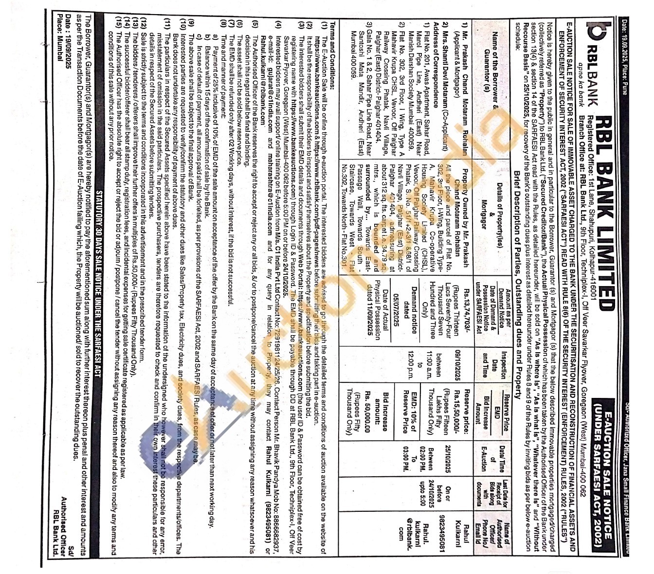 All the piece and parcel of Flat No. 302, 3rd Floor, I-Wing, Building Type-A. Mahavir Krupa Co-operative Housing Society Limited (CHSL), Vevoor, Off Palghar Railway Crossing Phatak, S. No. 51/1+2+3/1 868/1 of Navil Village, Palghar (East) District-Palghar 401404, admeasuring at about 312 sq. fts. carpet i.e. 34.79 sq. mtrs., which is bounded and surrounded by... Towards East-Passage Wall, Towards South -Staircase, Towards West Flat No.302, Towards North-Flat No.301.