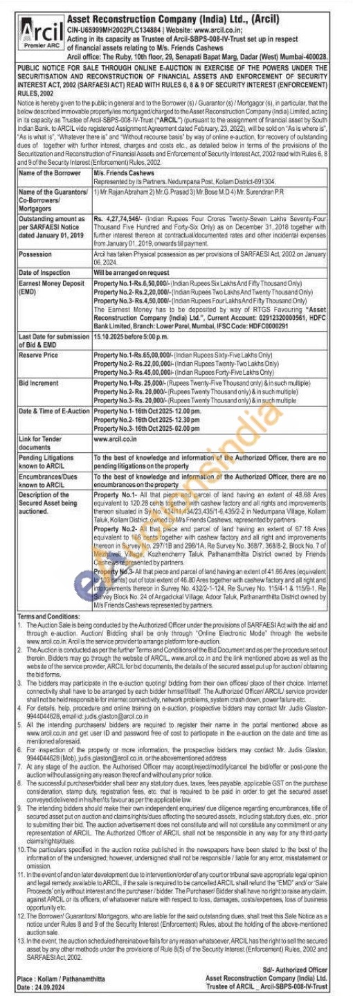 Property No.3-All that piece and parcel of land having an extent of 41.66 Ares (equivalent to 103 cents out of total extent of 46.80 Ares together with cashew factory and all right and improvements thereon in Survey No. 4322-1-124, Re Survey No. 1154-14 1155-1, Re Survey Black No. 24 of Angadical Village, Adoor Taluk, Pathanamthitta District owned by M's Friends Cashews represented by partners