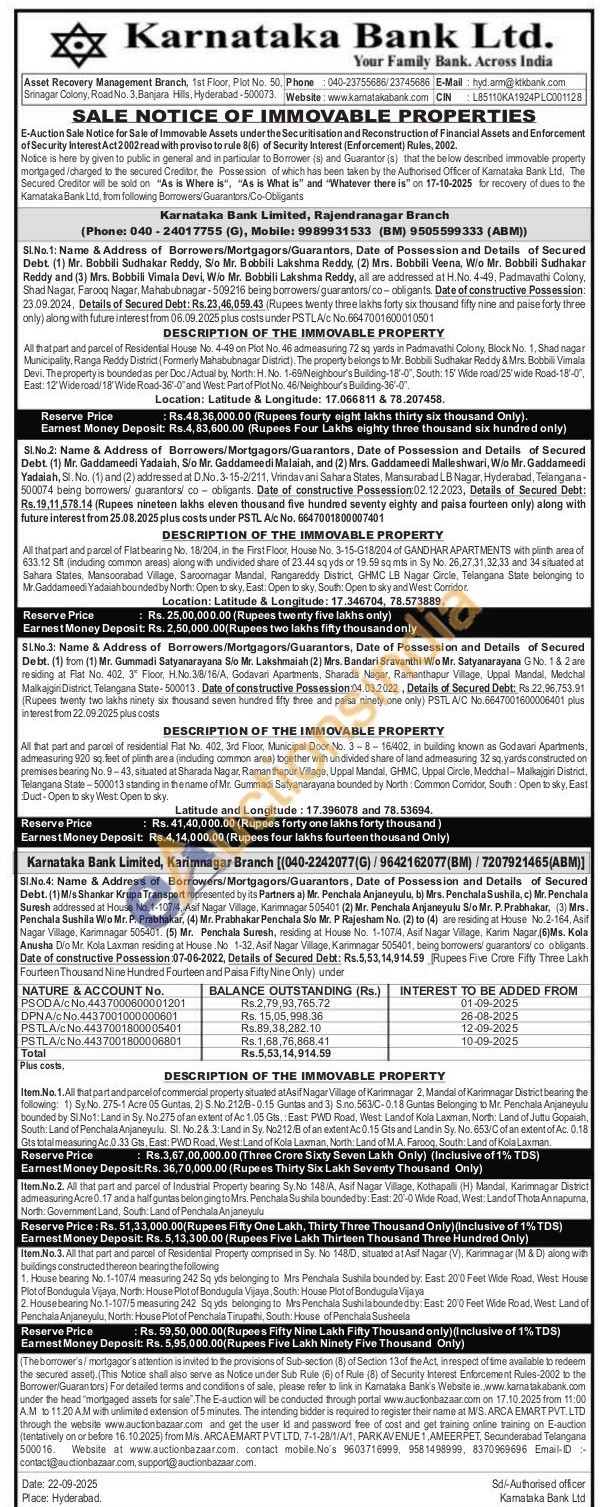 Item.No. 1.All that part and parcel of commercial property situated atAsif Nagar Village of Karimnagar 2, Mandal of Karimnagar District bearing the following: 1) Sy. No. 275-1 Acre 05 Guntas, 2) S.No.212/B-0.15 Guntas and 3) S.no.563/C-0.18 Guntas Belonging to Mr. Penchala Anjaneyulu bounded by Sl.No1: Land in Sy. No.275 of an extent of Ac 1.05 Gts, East: PWD Road, West: Land of Kola Laxman, North: Land of Juttu Gopaiah, South: Land of Penchala Anjaneyulu. Sl. No.28.3: Land in Sy. No212/B of an extent Ac 0.15 Gts and Landin Sy. No. 653/C of an extent of Ac. 0.18 Gts total measuring Ac.0.33 Gts, East: PWD Road, West: Land of Kola Laxman, North: Land of M.A. Farooq, South: Land of Kola Laxman.