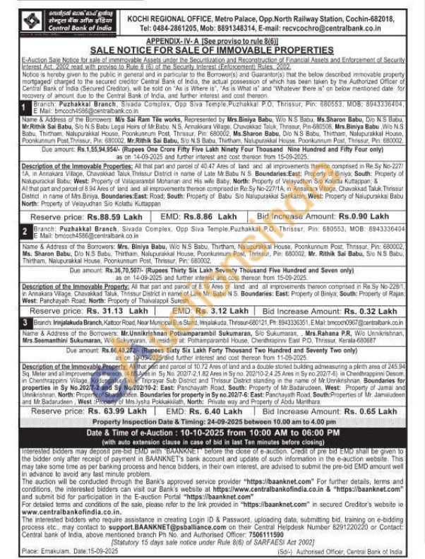 1) All that part and parcel of 40.47 Ares of land and all improvements thereon comprised in Re Sy No-2271 1A, in Annakara Village, Chavakkad Taluk, Thrissur District in name of Late Mr. Babu N S Boundaries:East: Property of Biniya, South: Property of Nalupurackal Babu, West: Property of Valaparambil Mohanan and His wife Baby, North: Property of Velayudhan Sio Kolatu Kuttappan; & All that part and parcel of 8.94 Ares of land and all improvements thereon comprised in Re Sy No-227/1A, in Annakara Village, Chavakkad Taluk Thrissur District in name of Mrs Biriya. Boundaries: East: Road, South: Property of Babu Sio Nalupurakkal Sankaran: West: Property of Nalupurakkal Babu North: Property of Velayudhan Sio Kolattu Kuttappen