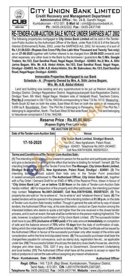 Land and building now existing and any superstructure to be put up thereon situated at Dindigul District, Dindigul Registration District, Nagalnayackanpatti Sub-Registration District Dindigul Town, 6th Ward, Nagal Nagar, Westem side of Vedapatti Road, Teachers Colony, Plot No.2 comprised in Old T.S.No. 1942/4A corresponding to New T.S.No. 101/2. Measuring North-South 82 feet on both the sides, East-West 45 feet on both the sides in all measuring 3,690 sq ft. Boundaries: East-The Plot No 3 belonging to Periasamy, West-The Plot No.1 belonging to Jeganathan, North-The East-West 30 feet wide Road, South-The land belonging to Vasudevan comprised in TS No. 1942/48