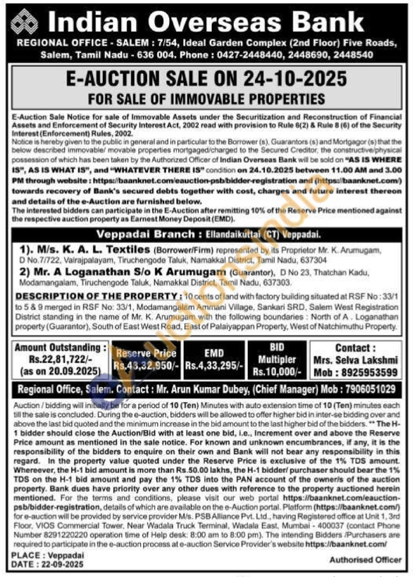 10 cents of land with factory building situated at RSF No: 33/1 to 5 & 9 merged in RSF No: 33/1, Modamangalam Ammani Village, Sankari SRD, Salem West Registration District standing in the name of Mr. K. Arumugam with the following boundaries: North of A. Loganathan property (Guarantor), South of East West Road, East of Palaiyappan Property, West of Natchimuthu Property