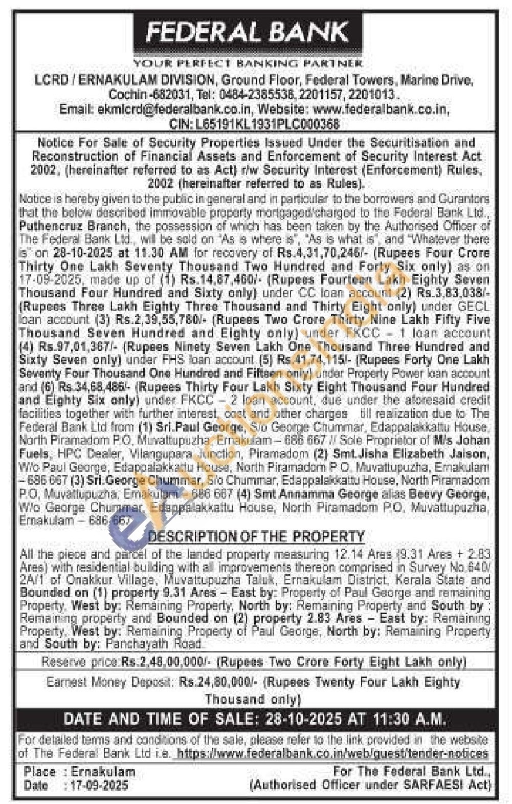 All the piece and parcel of the landed property measuring 12.14 Ares (9.31 Ares + 2.83 Ares) with residential building with all improvements thereon comprised in Survey No.640/2A/1 of Onakkur Village, Muvattupuzha Taluk, Ernakulam District, Kerala State and Bounded on (1) property 9.31 Ares - East by: Property of Paul George and remaining Property, West by: Remaining Property, North by: Remaining Property and South by: Remaining property and Bounded on (2) property 2.83 Ares East by: Remaining Property, West by: Remaining Property of Paul George, North by: Remaining Property and South by: Panchayath Road