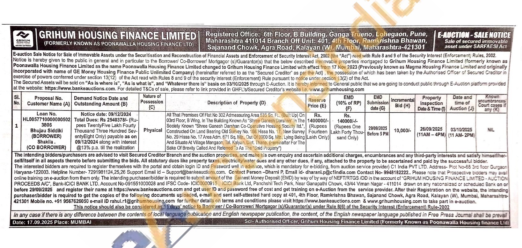 All That Premises Of Flat No 302 Admeasuring Area 535 Sc, Ft. (Built Up) On 03rd Floor, B Wing, In The Building Known As "Shrze Ganesh Darshan" In The Society Known "Shree Ganesh Darshan Co-Operative Housing crativa Housing Society Itd." Constructed On Land Bearing Old Survey No. 166 Hissa No. 17, New Survey No. 29 Hissa No. 17 Area Adm. 671 Sq. Mtr., Out Of 9900 Sq. Mtr., Lying Being And Situate At Village Mangaon, Tal. Kalyan, Dist. Thane. (Hereinafter For The Sake Of Brevity Called And Referred To As The "Said Property")