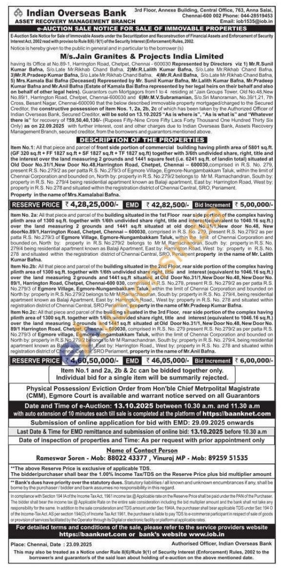Item No. 2a: All that piece and parcel of the building situated in the 1st Floor rear side portion of the complex having plinth area of 1300 sq.ft. together with 1/6th undivided share right, title and interest equivalent to 1040.16 sq.ft.) over the land measuring 2 grounds and 1441 sq.ft situated at old door No.31/1 New door No.48, New doorNo.89/1, Harrington Road, Chetpet, Chennai-600030, comprised in R.S. No. 279, present R.S. No.279/2 as per patta R.S. No.2793 of Egmore Village, Egmore-Nungambakkam Taluk, within the limit limit of Chennai Corporation and bounded on, North by property in RS. No 279/2 belongs to Mr M. Ramachandran, South by: property in R.S. No. 27914 being residential apartment known as Balaji Apartment, East by: Harrington Road, West by: property in R.S. No 278 and situated within the registration district of Chennai Central, SRO, Periament property in the name of Mr. Lalith Kumar Bafna. Item No.2b: All that piece and parcel of the building situated in the 2nd Floor, rear side portion of the complex having plinth area of 1300 sq.ft. together with 1/6th undivided share right, title and interest (equivalent to 1046.16 sq.ft.) over the land measuring 2 grounds and 1441 sq and 1441 sq.ft situated at Old Door No.31/1. New Door No.48, New Door No. 89/1, Harrington Road, Chetpet, Chennai-600 030, comprised in R.S. No. 279, present R.S. No.279/2 No.279/2 as per patia R.S. No.279/3 of Egmore Village, Egmore-Nungambakkam Taluk, within the limit of Chennai Corporation and bounded on North by: property in R.S. No.279/2 belongs to Mr M Ramachandran, South by: property in R.S. No. 2719/4, being residential apartment known as Balaji Apartment. East by: Harington Road, West by: property in R.S. No. 278 and situated within registration district of Chennai Central, SRO Periament, Periament, property in the name of Mr. Pradeep Kumar Bafna. Item No.2c: All that piece and parcel of the building situated in the 3rd Floor, rear side portion of the complex having plinth area of 1300 sq.ft. together with 1/6th undivided share right, title and interest (equivalent to 1046.16 sq.ft.) over the land measuring 2 grounds and 1441 sq.ft situated at Old Door No.31/1, New Door No. 48, New Door No. 89/1 Harrington Road, Chatpet, Chennai-600030, comprised in R.3. No. 279 present R.S. No.279/2 as per patta RS. No 279/3 of Egmore village. Egmore-Nungambakkam Taluk, within the limit of Chennai Corporation and bounded on North by: property in R.S.No.279/2 belongs to Mr M Ramachandran. South by, property in R.S. No. 27914, being residential apartment known as Balaji apartment. East by: apartment known as Balaji apartmen by: Harrington Road, West West by property in R.S. No. 278 and situated within registration district of Cherinai Central, SRO Periament, property in the name of of Mr Mr. Anill Anil Bafna