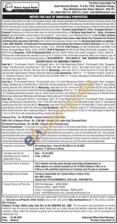 Item No.1: Tiruchirapalli District, Tiruchirapalli Joint I & II Sub-Registration District, Tiruchirapalli Taluk, Varaganeri Village, Old Block No.8, Old Ward No.7, Old T.S.No. 745, New Ward No. (H)"0", New Block No.6, New T.5.No.17, the building bearing Door No.22A, Old Door No. 24. Measuring: east-west 18.75 ft. North South 44 ft (Total 825 Sq.ft). with all other appurtenance thereon within the following Four Boundaries: North of "C" Schedule Property, South of "D" Schedule Property, East of: North South Common Wall. West of: Property belonging to Ramamirtham Muthuraja. his brother and legal heirs. Item No.2: Thiruchirapalli District, Thiruchirapalli Joint I & II Sub-Registration District, Tiruchirapalli Taluk, Varaganeri Village, Old Block No.8, Old Ward No.7, Old TS No.745, New Ward No.(H)"O", New Block No.6, New TS No.17, the building bearing Door No.22A, Old Door No.24. Measuring: east-west 18.75 ft, north south 8 tt. 1 inch (total 153.09 sq.ft) with all other appurtenance thereon within the following Four Boundaries: North of: "A" Schedule partitioned property, South of: "B" Schedule partitioned property, East of: North South Common wall, West of Property Belonging to G. Ramamirtham Muthuraja, Annamalai Muthuraja and Natarajan Muthuraka and 4 ft wide North South Lane Item No.3: Tiruchirapalli District, Tiruchirapalli Joint I & II Sub-Registration District, Tiruchirapalli Taluk, Varaganeri Village, Old Block No. 8. Old Ward No. 7, Old T.S.No. 745. New Ward No. (H)"O", New Black No.6, New TS No. 17, the building bearing Door No 22A, Old Door No: 24, Measuring: east-west 184 ft. North South 31.9 (total 583.77 sq.ft) with all other appurtenance thereon within the following Four Boundaries: North of Northern side of "C" Schedule property, East of North South Common Wall, South and West of: North South Land comprised in TS No. 18. The total extent of items Nos 1 to 3 is 1510 Sq.ft with residential building constructed thereon