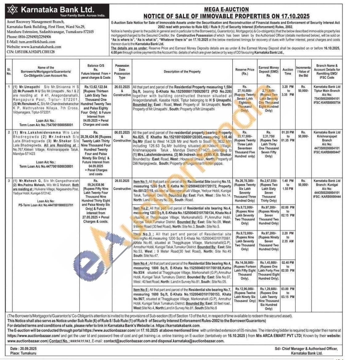 3) Item No.2: All that part and parcel of Residential site bearing No.4, measuring 1200 Sq.ft, E-Khata No. 152500403101700134, Khata No.4 situated at Thaggikuppe Village, Markonahalli (G. P) Amruthur Hobli, Kunigal Taluk, Tumakur District. Bounded By: East: Site No.09, West: 9 Meter Road (30 feet Road), North: Site No. 3, South: Site No.5