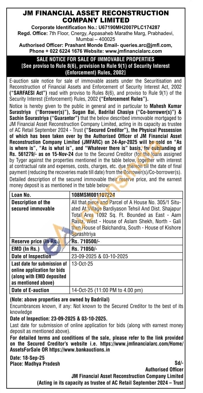 All that piece and Parcel of A House No. 305/1 Situ-ated At Village Bardiyason Tehsil And Dist. Shajapur Total Area 1092 Sq. Ft. Bounded as East Aam Rasta, West House of Aslam Shekh, North Gali then House of Balchandra, South House of Kishore Sorashtriya