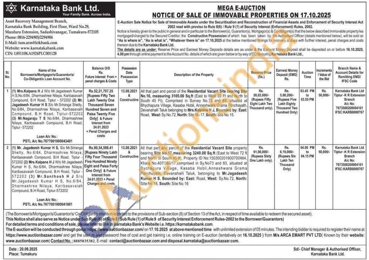 2) All that part and parcel of the Residential Vacant Site property bearing Site No.17, measuring 3240.00 Sq.ft (East to West 72 ft and North to South 45 ft), Property ID No: 150300201900700484, Khata No.407/266/17,comprised in Sy.No73 and 83, situated at Bychapura Village, Kasaba Hobli, Anneshwara Grama Panchayath, Devanahalli Taluk, belonging to Mr.Jagadeesh Kumar H S. Bounded by: East: Road, West: Sy No.72, North: Site No. 18, South: Site No. 16