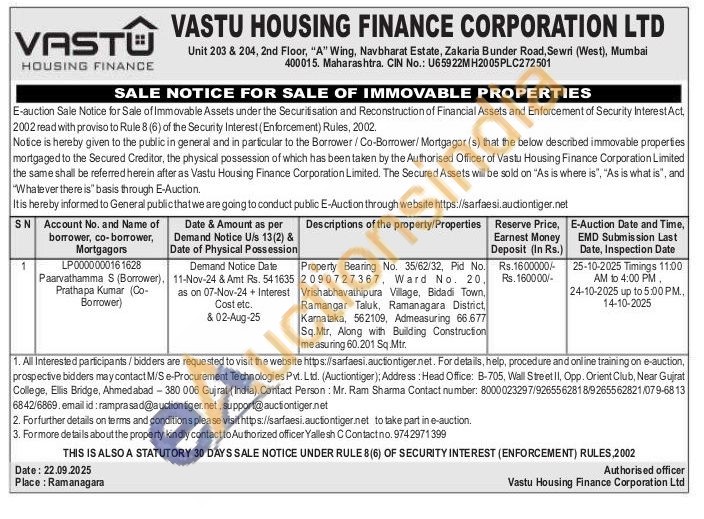 Property Bearing No. 35/62/32, Pid No. 2090727367, Ward No. 20. Vrishabhavathipura Village, Bidadi Town, Ramangar Taluk, Ramanagara District, Karnataka, 562109, Admeasuring 66.677 Sq.Mtr. Along with Building Construction measuring 60.201 Sq.Mtr.