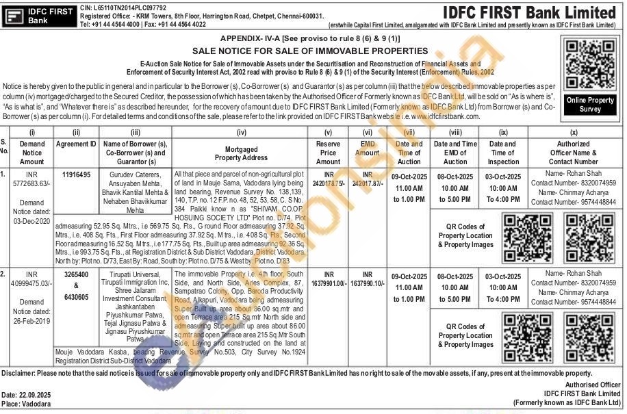 immovable Property i,e. 4th floor, South Side, and North Side, Aries Complex, 87, Sampatrao Colony, Opp. Baroda Productivity Road, Alkapuri, Vadodara being admeasuring Super Built up area about 86.00 sq.mtr and open Terrace area 215 Sq.mtr North side and admeasuring Super built up area about 86.00 sq.mtr and open Terrace area 215 Sq.Mtr South Side, Laying and constructed on the land at