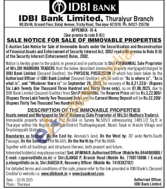Assets owned and Mortgaged by Shri.P Mohanraj (Sole Proprietor of Ms.Sri Madhura Traders): Immovable property situated at Plot No.664 in Survey No.505/3 admeasuring 1489.1/2 Sq.ft in Thuraiyur within the Registration Sub-District Thathayengarpet, Musiri Taluk in Araichi Village and Tiruchirappalli District. Boundaries as follows: On the East by: Ammasi's land, On the West by: 30' wide North-South Passage, On the South by: Plot No.665, On the North by: Plot No.664A