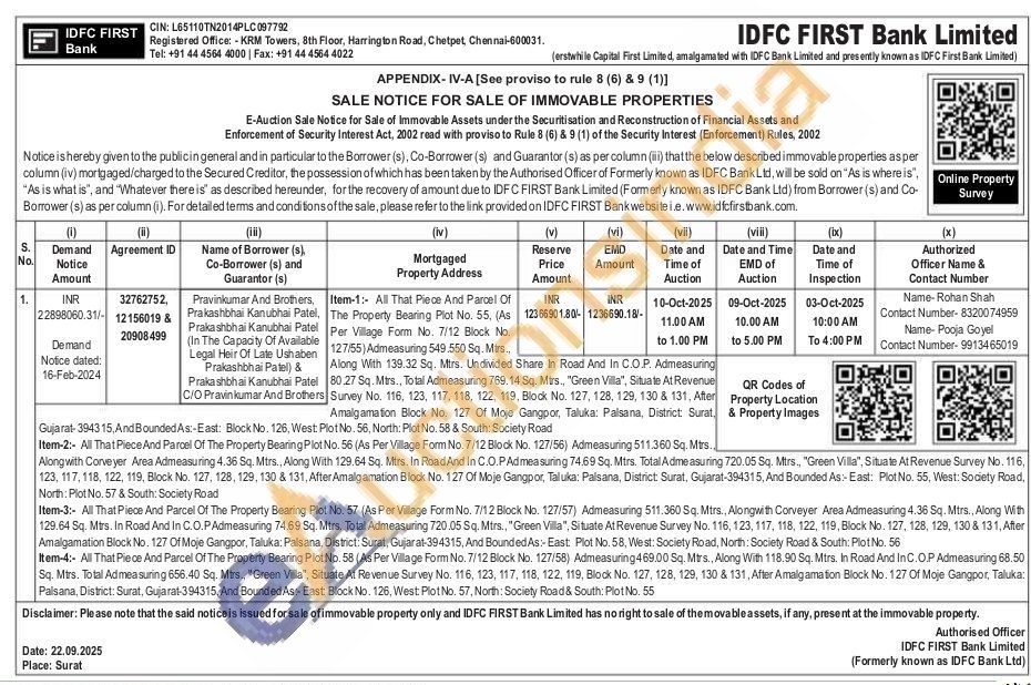 Item-1:- All That Piece And Parcel Of The Property Bearing Plot No. 55, (As Per Village Form No. 7/12 Block No Item-2:- All That Piece And Parcel Of The Property Bearing Plot No. 56 (As Per Village Form No. 7/12 Block No. 127/56) Admeasuring 511.360 Sq. Mtrs. Along with Corveyer Area Admeasuring 4.36 Sq. Mtrs., Along With 129.64 Sq. Mirs. In Road And In C.O.PAd measuring 74.69 Sq. Mtrs. Total Admeasuring 720.05 Sq. Mirs., "Green Villa", Situate At Revenue Survey No. 116, 123, 117, 118, 122, 119, Block No. 127, 128, 129, 130 & 131, After Amalgamation Block No. 127 Of Moje Gangpor, Taluka: Palsana, District: Surat, Gujarat-394315, And Bounded As:- East: Plot No. 55, West: Society Road, North: Plot No. 57 & South: Society Road Item-3:- All That Piece And Parcel Of The Property Bearing Plot No. 57 (As Per Village Form No. 7/12 Block No. 127/57) Admeasuring 511.360 Sq. Mtrs., Alongwith Corveyer Area Admeasuring 4.36 Sq. Mtrs., Along With 129.64 Sq. Mtrs. In Road And In C.O.PAdmeasuring 74.69 Sq. Mtrs. Total Admeasuring 720.05 Sq. Mtrs., "Green Villa", Situate At Revenue Survey No. 116, 123, 117, 118, 122, 119, Block No. 127, 128, 129, 130 & 131, After Amalgamation Block No. 127 Of Moje Gangpor, Taluka: Palsana, District: Surat, Gujarat-394315, And Bounded As:- East: Plot No. 58, West: Society Road, North: Society Road & South: Plot No. 56 Item-4:- All That Piece And Parcel Of The Property Bearing Plot No. 58 (As Per Village Form No. 7/12 Block No. 127/58) Admeasuring 469.00 Sq. Mtrs., Along With 118.90 Sq. Mtrs. In Road And InC.O.P Admeasuring 68.50 Sq. Mtrs. Total Admeasuring 656.40 Sq. Mtrs., "Green Villa", Situate At Revenue Survey No. 116, 123, 117, 118, 122, 119, Block No. 127, 128, 129, 130 & 131, After Amalgamation Block No. 127 Of Moje Gangpor, Taluka: Palsana, District: Surat, Gujarat-394315, And Bounded As:- East: Block No. 126, West Plot No. 57, North: Society Road & South: Plot No. 55