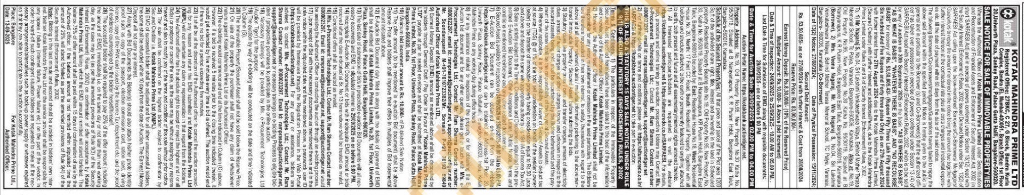 Sq.ft of the undivided share, right, title, interest and ownership in the land in Scheduled property. Residential Property Bearing site No. 19, Old Property No.95, New Property No. 30, Katha No. 95/30/19, Situated at B Narayanapura, KR Puram Hobli, Bangalore East Taluk, Bangalore-560016 bounded by: East: Residential House No. 18, West: Residential House No. 20, North: 17 Feet CC Road, South: Residential Property. Together with all buildings and structure attached to the earth or permanently fastened to anything attached to earth, both present and future and all easementary/mamool rights annexed thereto.