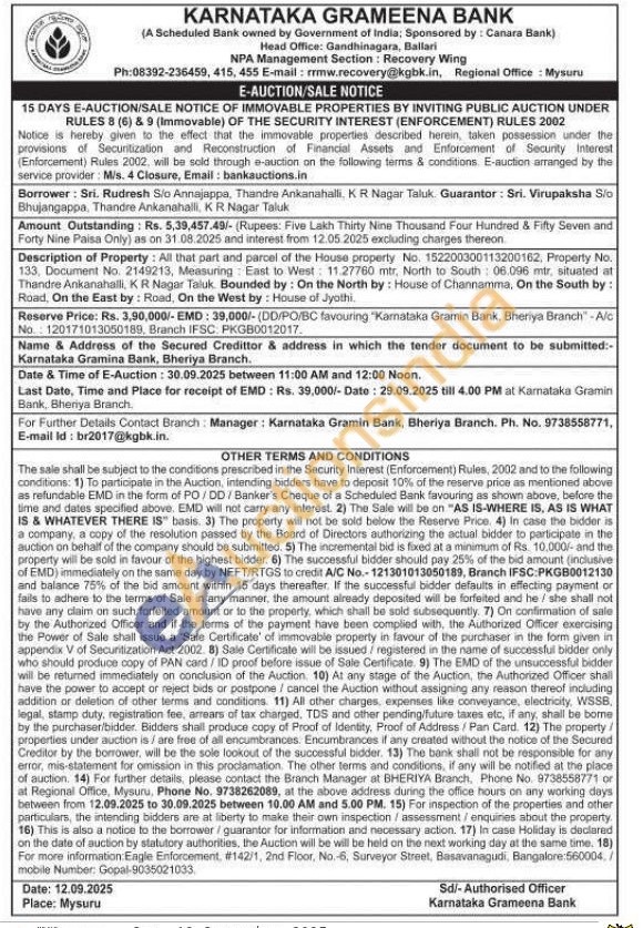 Description of Property: All that part and parcel of the House property No. 152200300113200162, Property No. 133, Document No. 2149213, Measuring East to West: 11.27760 mtr, North to South: 06.096 mtr, situated at Thandre Ankanahalli, KR Nagar Taluk. Bounded by: On the North by: House of Channamma. On the South by: Road, On the East by: Road, On the West by: House of Jyothi