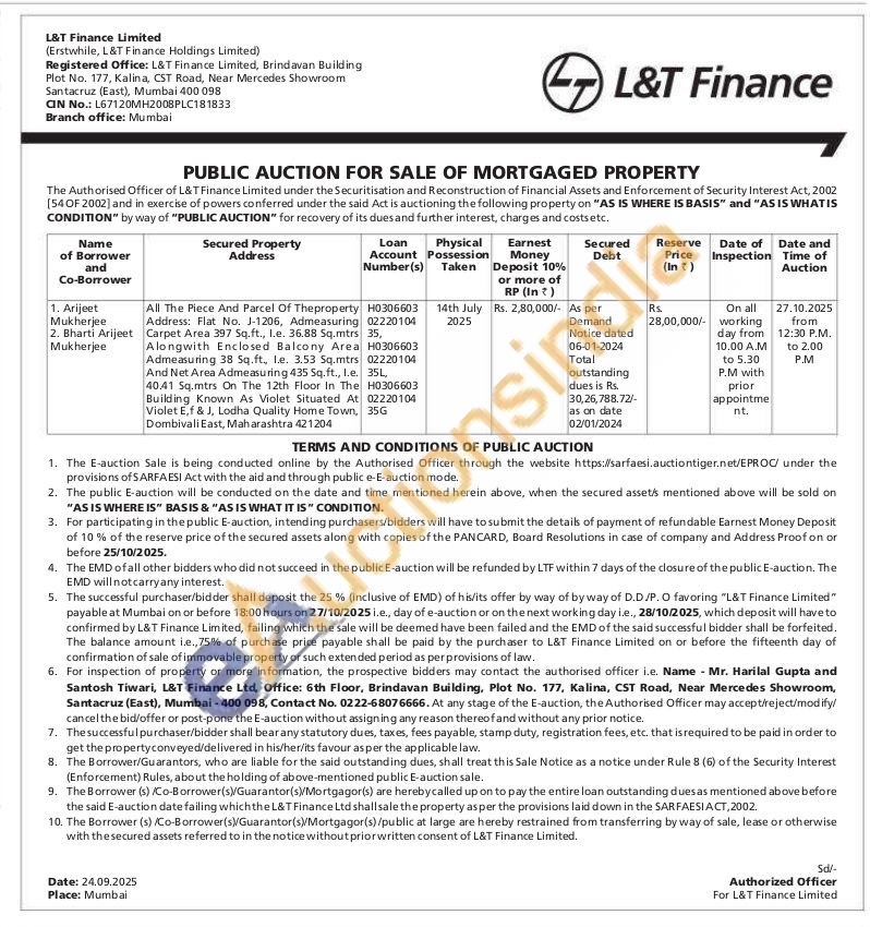 All The Piece And Parcel Of Theproperty Address: Flat No. J-1206, Admeasuring Carpet Area 397 Sq.ft., l.e. 36.88 Sq.mtrs Alongwith Enclosed Balcony Area Admeasuring 38 Sq.ft, le. 3.53 Sq.mtrs And Net Area Admeasuring 435 Sq.ft., l.e. 40.41 Sq.mtrs On The 12th Floor In The Building Known As Violet Situated At Violet E, f & J, Lodha Quality Home Town, Dombivali East, Maharashtra 421204