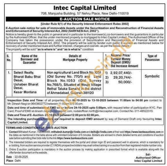 Non agricultural Land Block No.1051 (Old Survey No. 770/1) and Land Block No.1053 (Old Survey No.768/1), Situated at Mouje Village Rethal Taluka Sanand in the district of Ahmedabad, Gujarat-381120