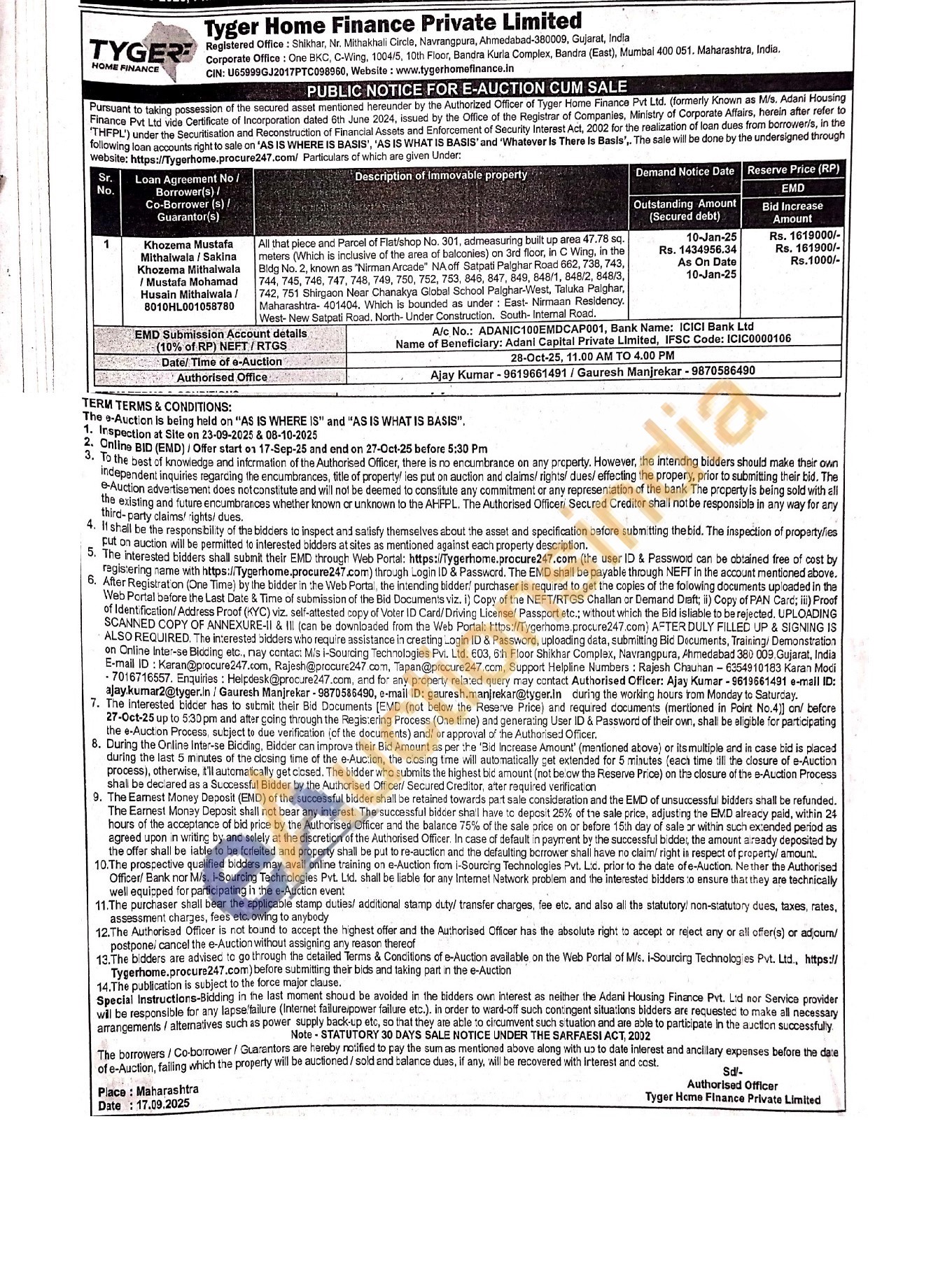 All that piece and Parcel of Flat/shop No. 301, admeasuring built up area 47.78 sq. meters (Which is inclusive of the area of balconies) on 3rd floor, in C Wing, in the Bidg No. 2, known as "Nirman Arcade" NA off Satpali Palgher Road 662, 738, 743, 744, 745, 746, 747, 748, 749, 750, 752, 753, 845, 847, 849, 848/1, 848/2, 848/3, 742, 751 Shirgaon Near Chanakya Global School Paighar-West, Taluka Palghar, Maharashtra-401404, Which is bounded as under: East Nirmaan Residency. West-New Satpati Road, North- Under Construction, South Internal Road.