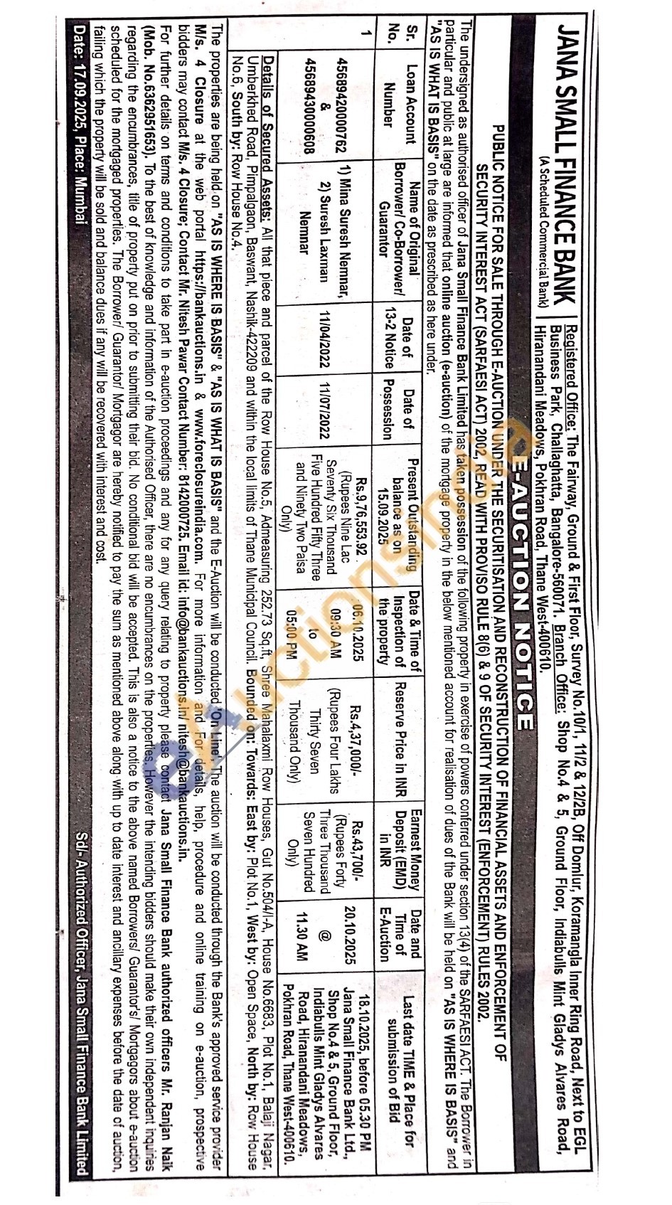 Details of Secured Assets: All that piece and parcel of the Row House No.5, Admeasuring 252.73 Sq.ft, Shree Mahalaxmi Row Houses, Gut No.504/l-A, House No.6683, Plot No.1, Balaji Nagar, Umberkhed Road, Pimpalgaon, Baswant, Nashik-422209 and within the local limits of Thane Municipal Council. Bounded on: Towards: East by: Plot No.1, West by: Open Space, North by: Row House No.6, South by: Row House No.4