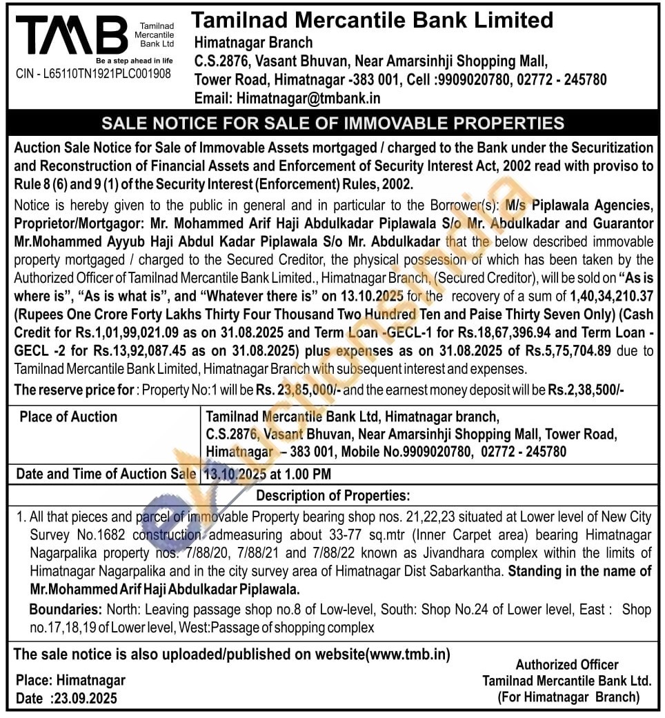 1. All that pieces and parcel of immovable Property bearing shop nos. 21,22,23 situated at Lower level of New City Survey No.1682 construction admeasuring about 33-77 sq.mtr (Inner Carpet area) bearing Himatnagar Nagarpalika property nos. 7/88/20, 7/88/21 and 7/88/22 known as Jivandhara complex within the limits of Himatnagar Nagarpalika and in the city survey area of Himatnagar Dist Sabarkantha. Standing in the name of Mr.Mohammed Arif Haji Abdulkadar Piplawala.
