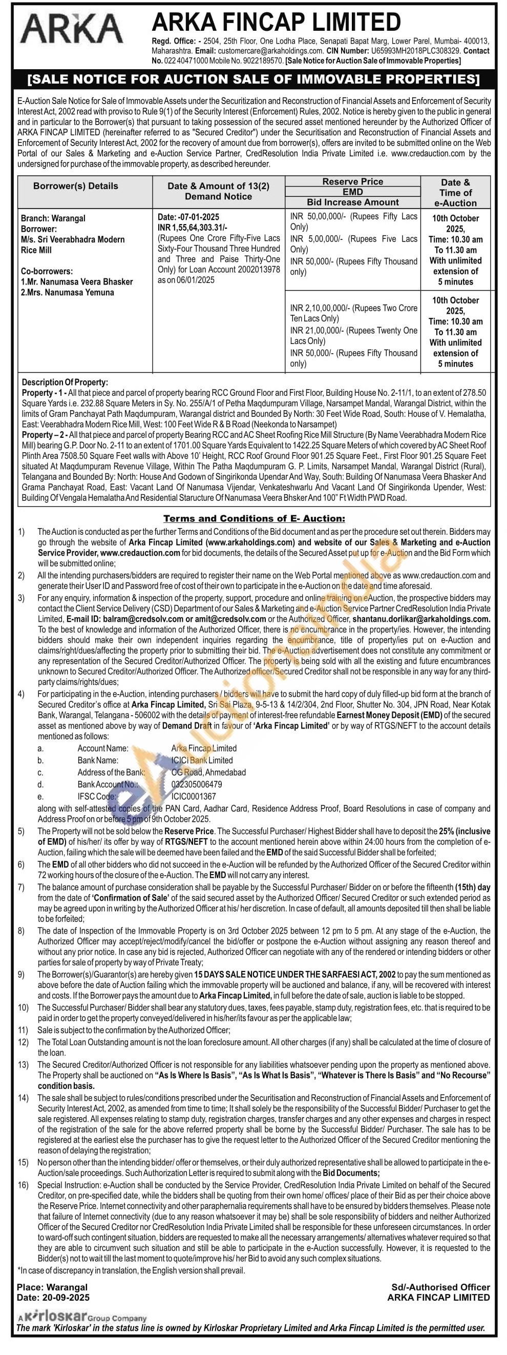 All that piece and parcel of property Bearing RCC and AC Sheet Roofing Rice Mill Structure (By Name Veerabhadra Modern Rice Mill) bearing G.P. Door No. 2-11 to an extent of 1701.00 Square Yards Equivalent to 1422.25 Square Meters of which covered by AC Sheet Roof Plinth Area 7508.50 Square Feet walls with Above 10' Height, RCC Roof Ground Floor 901.25 Square Feet., First Floor 901.25 Square Feet situated At Maqdumpuram Revenue Village, Within The Patha Maqdumpuram G. P. Limits, Narsampet Mandal, Warangal District (Rural), Telangana and Bounded By: North: House And Godown of Singirikonda Upendar And Way, South: Building Of Nanumasa Veera Bhasker And Grama Panchayat Road, East: Vacant Land Of Nanumasa Vijendar, Venkateshwarlu And Vacant Land Of Singirikonda Upender, West: Building Of Vengala Hemalatha And Residential Staructure Of Nanumasa Veera Bhsker And 100" Ft Width PWD Road