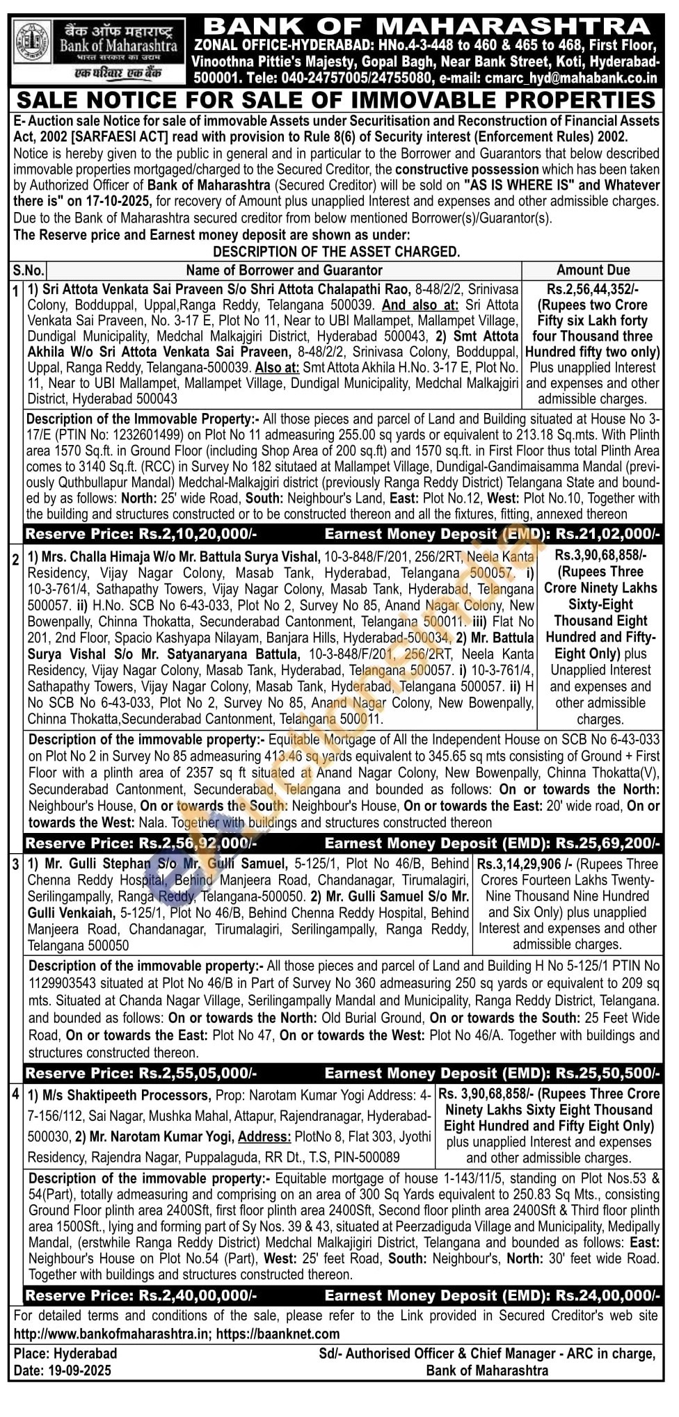 All those pieces and parcel of Land and Building 17/E (PTIN No: 1232601499) on Plot No 11 admeasuring 255.00 sq yards or equivalent to area 1570 Sq.ft. in Ground Floor (including Shop Area of 200 sq ft) and 1570 sq.ft. in First comes to 3140 Sq.ft. (RCC) in Survey No 182 situtaed at Mallampet Village, ously Quthbullapur Mandal) Medchal-Malkajgiri district (previously Ranga Reddy District) ed by as follows: North: 25 wide Road, South: Neighbour's Land, East: Plot No. 12. West: the building and structures constructed or to be constructed thereon and all the fixtures