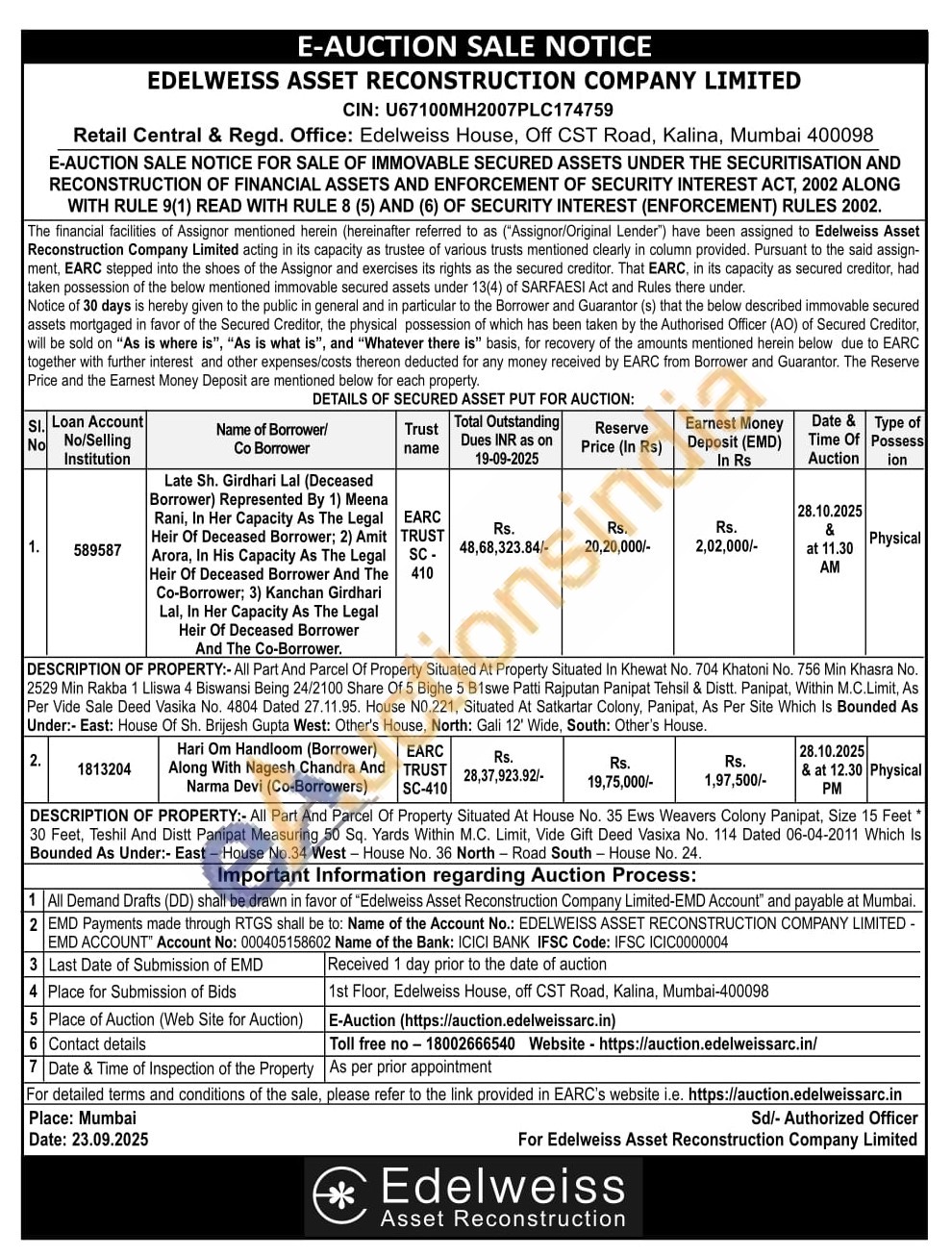 DESCRIPTION OF PROPERTY:- All Part And Parcel Of Property Situated At House No. 35 Ews Weavers Colony Panipat, Size 15 Feet 30 Feet, Teshil And Distt Panipat Measuring 50 Sq. Yards Within M.C. Limit, Vide Gift Deed Vasixa No. 114 Dated 06-04-2011 Which Is Bounded As Under:- East House No.34 West House No. 36 North Road South- House No. 24
