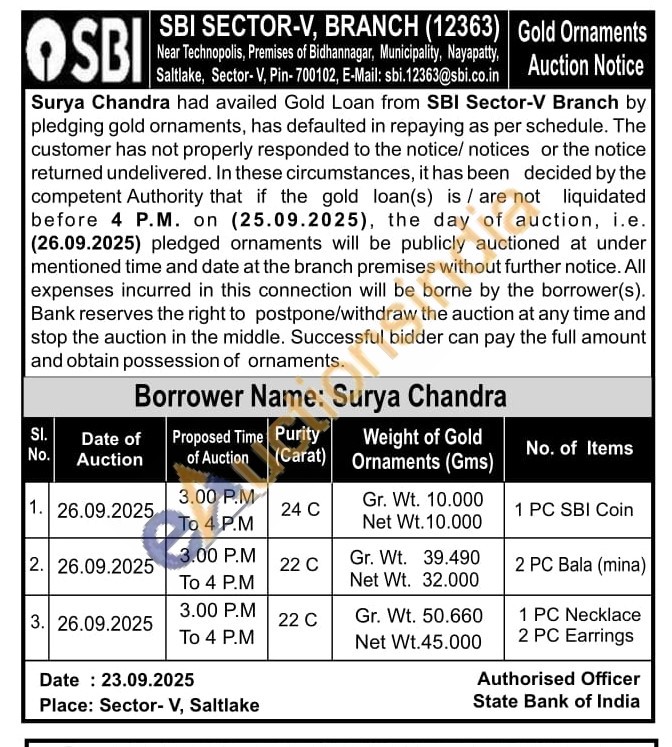 State Bank of India Gold Auctions Auction in South 24 Parganas