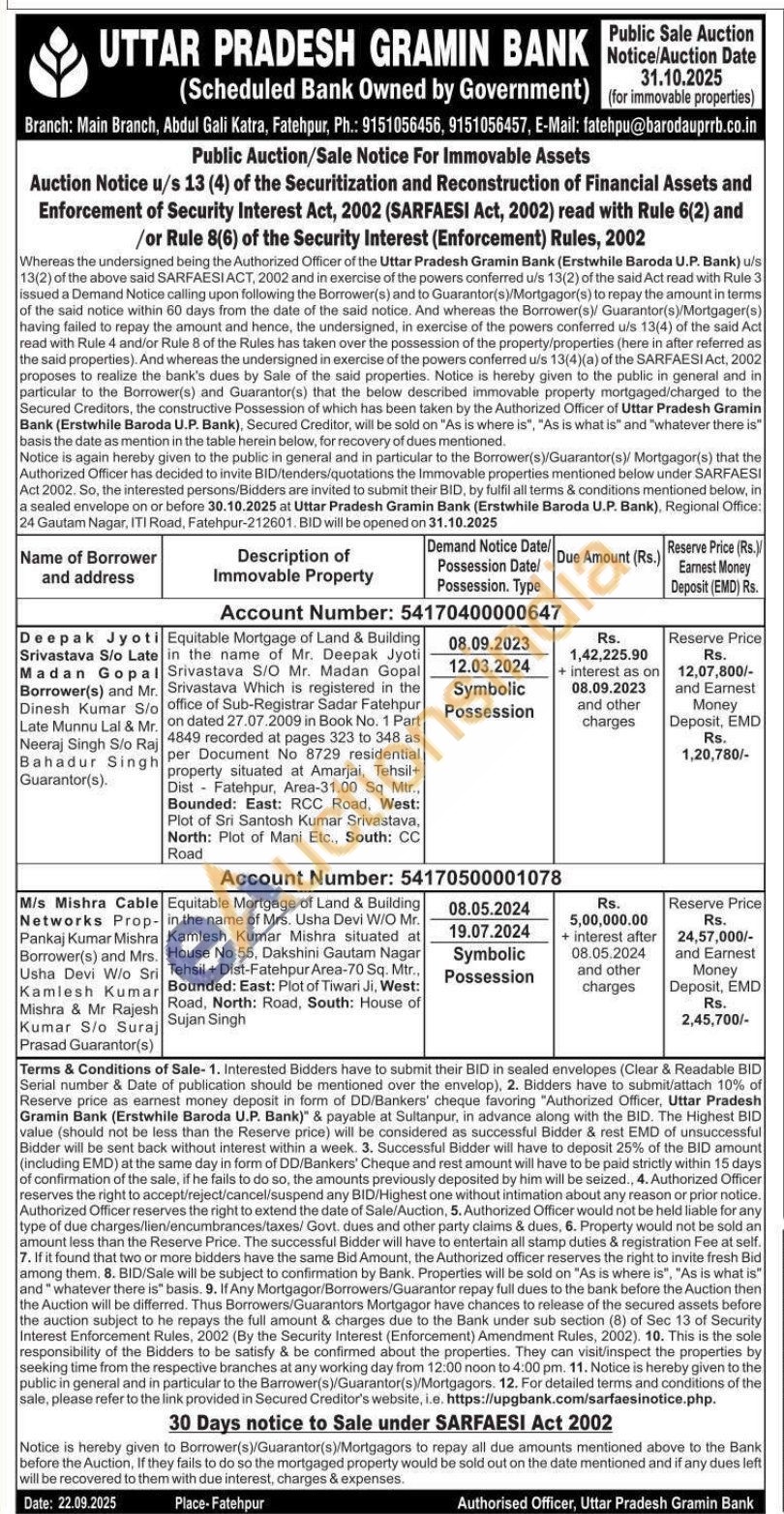 Equitable Mortgage of Land & Building Prop-in the name of Mrs. Usha Devi W/O Mr. Kamlesh Kumar Mishra situated at House No 55. Dakshini Gautam Nagar Tehsil Dist-Fatehpur Area-70 Sq. Mtr., Bounded: East: Plot of Tiwari Ji, West: Road, North: Road, South: House of Sujan Singh