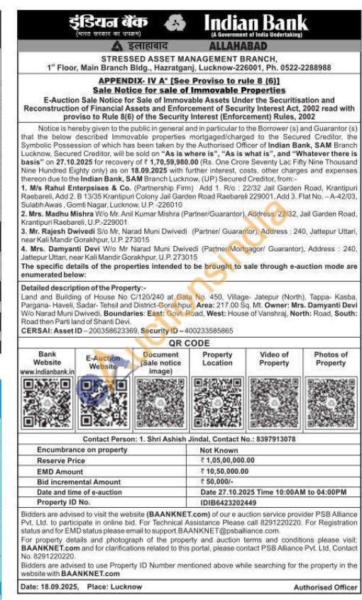 Land and Building of House No C/120/240 at Gata No. 450, Village- Jatepur (North), Tappa- Kasba, Pargana-Haveli, Sadar- Tehsil and District-Gorakhpur, Area: 217.00 Sq. Mt. Owner: Mrs. Damyanti Devi Wio Narad Muni Dwivedi, Boundaries: East: Govt. Road, West: House of Vanshraj, North: Road, South: Road then Parti land of Shanti Devi.