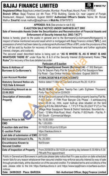 All that piece and parcel of the immovable property bearing Flat No F-502 Tower-F Fifth Floor Banyan City Phase I admeasuring about 65.04 sq. mes, super built-up area situated on the land bearing RS No.566/A/Pake-1,TP2FP No.35 (Old FP27) in The Village Moje Sayajipura Taluka & District Vadodara Bounded As East-12 Mirs Wide Road, West-Flat No. F-503 North-Flat No. F-501 South: Commercial Margin