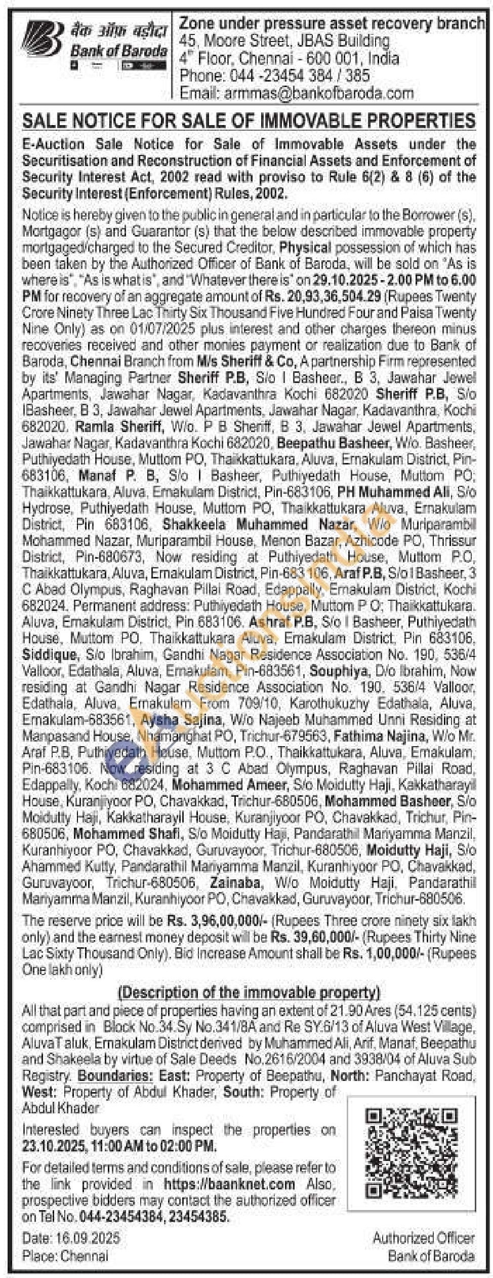 All that part and piece of properties having an extent of 21.90 Ares (54.125 cents) comprised in Block No.34. Sy No.341/8A and Re SY.6/13 of Aluva West Village, Aluvat aluk, Ernakulam District derived by Muhammed Ali, Arif, Manaf, Beepathu and Shakeela by virtue of Sale Deeds No.2616/2004 and 3938/04 of Aluva Sub Registry. Boundaries: East: Property of Beepathu, North: Panchayat Road, West: Property of Abdul Khader, South: Property of