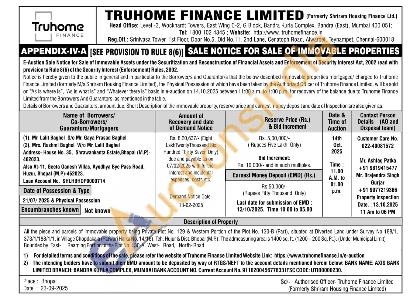 All the piece and parcels of immovable property being Private Plot No. 129 & Western Portion of the Plot No. 130-B (Part), situated at Diverted Land under Survey No 188/1, 373/1/188/1/1, in Village Chopdakala (Patwari Halka No. 14/16), Teh. Hujur & Dist. Bhopal (M.P.). The admeasuring area is 1400 sq. ft. (1200+200 Sq. Ft.). (Under Municipal Limit) Bounded by East- Reaming Portion of the Plot No. 130-A, West Road, North-Road
