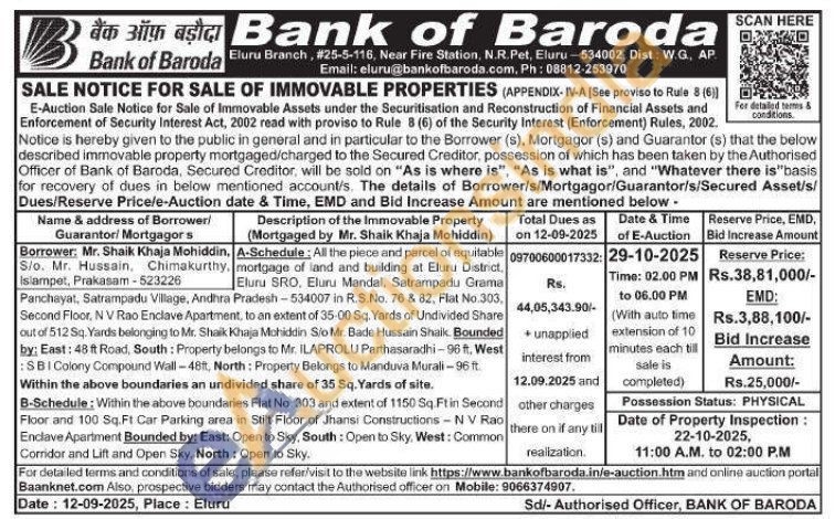 A-Schedule: All the piece and parcel of equitable mortgage of land and building at Eluru District, Eluru SRO, Eluru Mandal, Satrampadu Grama Panchayat, Satrampadu Village, Andhra Pradesh-534007 in R.S.No. 76 & 82, Flat No.303. Second Floor, NV Rao Enclave Apartment, to an extent of 35-00 Sq. Yards of Undivided Share out of 512 Sq. Yards belonging to Mr. Shaik Khaja Mohiddin S/o Mr. Bade Hussain Shaik. Bounded by: East: 48 ft Road, South: Property belongs to Mr. ILAPROLU Parthasaradhi-96 ft. West SBI Colony Compound Wall-48ft, North: Property Belongs to Manduva Murali -96 ft.