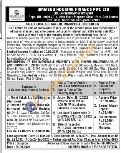 DESCRIPTION OF THE IMMOVABLE PROPERTY WITH KNOWN ENCUMBRANCE, IF ANY PROPERTY DESCRIPTION: All That Part And Parcel Of Property Bearing- Plot No.2, Block-B, Khasra No. 549/7, Area Measuring 60 Sq Yrds. I, E., 50.166 Sqr. Mtrs., Situated At Vikash Kunj Colony Hadbast Village Dharoti Khurd, Pargana And Tehsil-Loni, District-Ghaziabad, Bounded As East Plot 01 Others, West- Rasta 10 P Wide, North- Plot Of Others, South- Plot Of Others