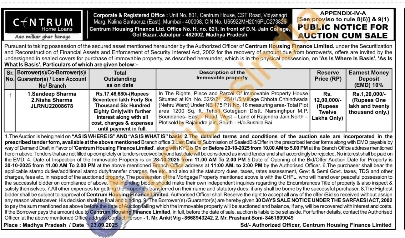 In The Rights, Piece and Parcel Of Immovable Property House Situated at Kh. No. 32/2/21, 254/1/5 Village Chhota Chhindwada (Nehru Ward) Under NB 175 P.H.No. 16 measuring area-Total Plot area 1200 Sq. ft. Tehsil Gotegaon Distt. Narsinghpur M.P. Boundaries- East Road, West - Land of Rajendra Jain, North Plot sold by Rajaindra jain, South-H/o Sushila Bai