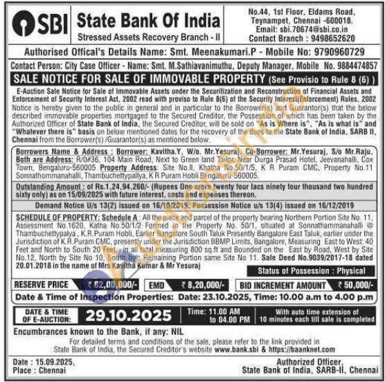 All the piece and parcel of the property bearing Northern Portion Site No. 11. Assessment No.1620, Katha No.50/1/2 Formed in the Property No. 50/1, situated at Sonnathammanahalli Thambuchettypalya, K.R. Puram Hobli, Earlier Bangalore South Taluk Presently Bangalore East Taluk, earlier under the Jurisdiction of K. R.Puram CMC, presently under the Jurisdiction BBMP Limits, Bangalore, Measuring East to West: 40 Feet and North to South 20 Feet, in all total measuring 800 sq.ft and Bounded on the East by Road, West by Site No.12, North by Site No 10, South by: Remaining Portion same Site No 11