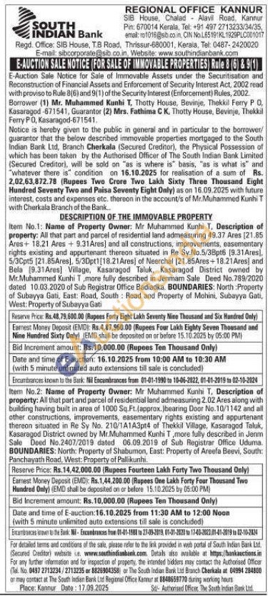 Item No.1: Name of Property Owner: Mr Muhammed Kunhi T. Description of property: All that part and parcel of residential land admeasuring 49.37 Ares (21.85 Ares+ 18.21 Ares + 9.31Ares) and all constructions, improvements, easementary rights existing and appurtenant thereon situated in Re Sy.No.5/38pt6 [9.31Ares), 5/3Cpt5 (21.85Ares), 5/30pt1[18.21 Ares) of Neerchal [21.85Ares+18.21 Ares) and Bela [9.31 Ares] Village, Kasaragod Taluk, Kasaragod District owned by Mr. Muhammed Kunhi T, more fully described in Jenmam Sale Deed No.789/2020 dated 10.03.2020 of Sub Registrar Office Badiadka. BOUNDARIES: North Property of Subayya Gati, East: Road, South Road and Property of Mohini, Subayya Gati, West: Property of Subayya Gati