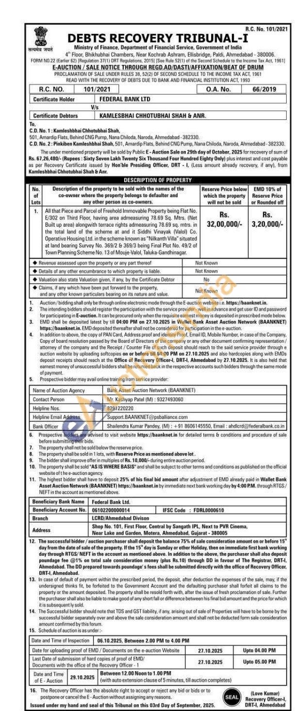 All that Piece and Percal of Freshold id in Immovable Property being Flat No. E/302 on Thint Floor, having area admeasuring 78.69 Sq. Mtrs. (Net Built op area) along with terrace rights admeasuring 78.69 sq mtrs. in the total land of the scheme at and it Siddhi Vinayak (Val Co Operative Housing Ltd. in the schisme known as "Nilkanth Villa situated at land bearing Survey No. 388/2 & 389/3 being Final Plot No. 492 of Town Planning Scheme No. 13 of Mouje-Valol, Teluke-Gandhinagar