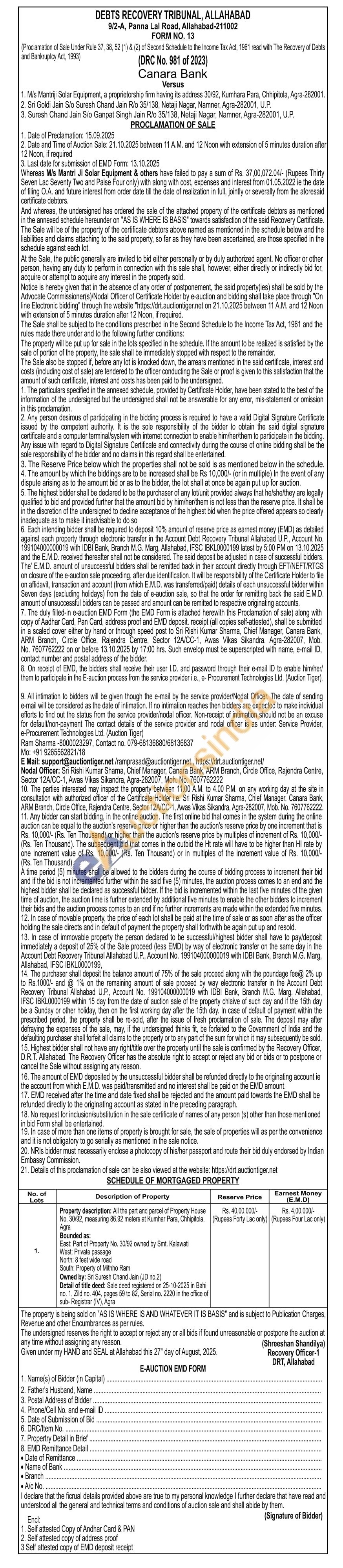 Property description: All the part and parcel of Property House No. 30/92, measuring 86.92 meters at Kumhar Para, Chhipitola, Agra