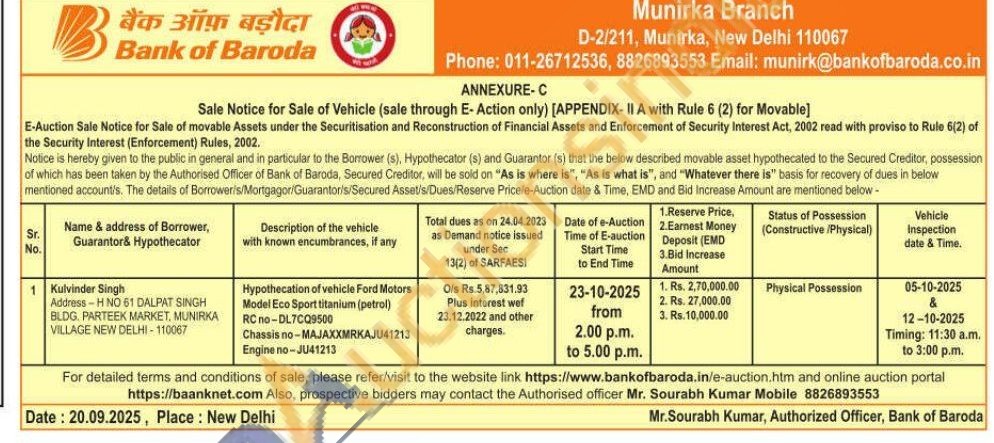 Hypothecation of Vehicle ford motors Model eco Sport titanium RC no DL7CQ9500 Engine no JU41213
