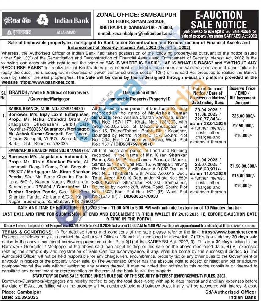 All that piece and parcel of Land and Building recorded in the name of Mr.Ashok Kumar Senapati, S/o.: Anama Charan Senapati, under Plot No.: 157/1177, Khata No.: 128/303, with Area: Ac.0.05 Dec., at Mouza: Bhusugaon Unit No.: 15, Thana/Tahasil: Barbil, Dist.: Keonjhar, Bounded by North: Plot No.: 157, South: Plot No.: 204, East: Abhimanyu Mishra, West: Plot No.: 157/IDIB50475978907B