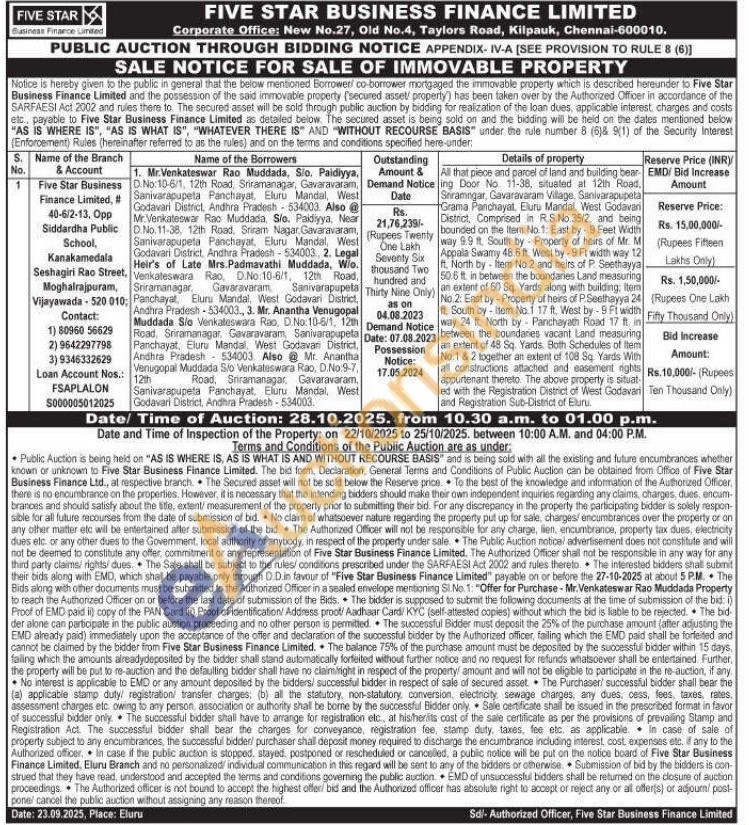 All that piece and parcel of land and building bear-ing Door No. 11-38, situated at 12th Road, Seramngar, Gavaravaram Village, Sanivarapupeta Grama Panchayat, Eluru Mandal, West Godavari District, Comprised in R.S.No.35/2, and being bounded on the Item No.1: East by -9 Feet Width way 9.9 ft. South by Property of heirs of Mr. M Appala Swamy 48.6 ft. West by-9 Ft width way 12 ft. North by Item No.2 and heirs of P. Seethayya 50.6 ft. in between the boundaries Land measuring an extent of 60 Sq. Yards along with building; Item No.2 : East by-Property of heirs of P.Seethayya 24 ft. South by Item No.1 17 ft. West by -9 Ft width an extent of way 24 ft. North by Panchayath Road 17 ft. in between the boundaries vacant Land measuring an extent of 48 Sq. Yards. Both Schedules of item No.1 & 2 together an extent of 108 Sq. Yards With all constructions attached and easement rights appurtenant thereto. The above property is situat ed with the Registration District of West Godavari and Registration Sub-District of Eluru