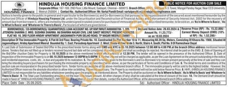 A Flat At 3rd Floor, Bearing Private No. 10, Constructed On Plot Number 10 & 11, Measuring 60.20 Sq. Meters, Consisting Of Khasra No. 1908, Situated At Jagannathpuri, Hridey Apartment Meerut Bounded By: 1. East: Parasdeep Apartment 2. West; Rasta 40 Feet Wide 3. North; Stairs 4. South; Plot No. 9 Of Rameshwar Dayal